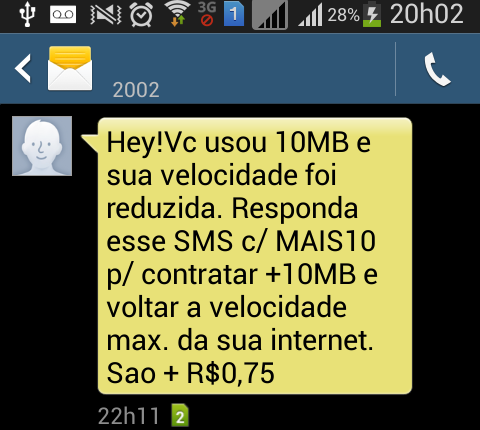 Quando a franquia estiver perto de acabar, o cliente vai receber SMS informando que atingiu 80%da franquia contratada. Quando atingir 100%, um novo SMS vai oferecer quatro opA�A�es para continuar a navegaA�A?o. A primeira A� para contratar um novo plano aumentando a franquia diA?ria; a segunda A� para recontratar a oferta atual, comprando um novo pacote de dados para o dia; a terceira A� para contratar um pacote mensal; e por fim o cliente poderA? optar por navegar grA?tis, com velocidade reduzida.