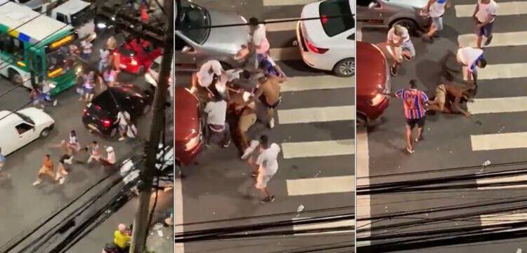 Mesmo após o homem cair no chão, o grupo continua com as agressões. O episódio aconteceu na avenida Joana Angélica, na região próxima à estação de metrô do Campo da Pólvora. Nas redes sociais, internautas relataram que o homem estaria com uma camisa do Bahia, mas seria torcedor do Vitória infiltrado.