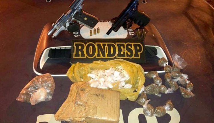 Com o bandoA�os PMs apreenderam duas pistolas calibres 9 mm (uso exclusivo das ForA�as Armadas e PolA�cia Federal) e 380, alA�m de 237 porA�A�es de cocaA�na, um tablete de maconha prensada e 44 trouxas da mesma erva.