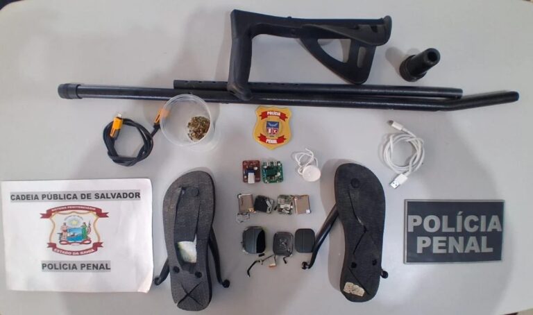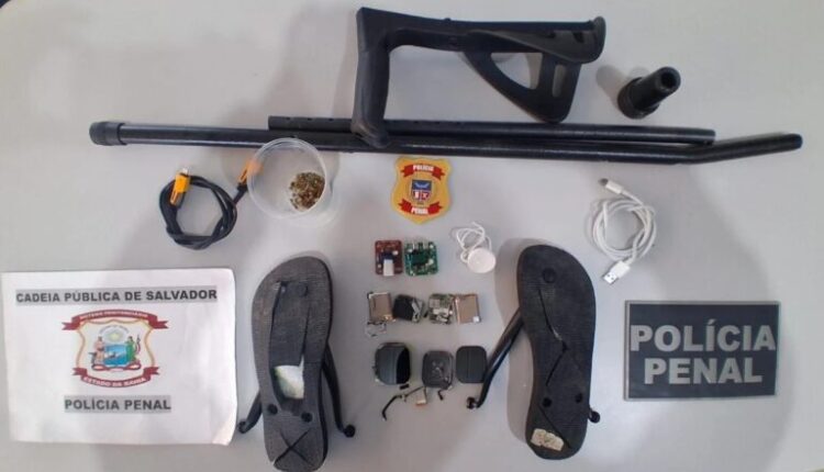 Uma mulher de 36 anos foi detida, nesta quarta-feira (7), ao tentar entrar na Cadeia Pública de Salvador com drogas e aparelhos eletrônicos escondidos. A visitante, mãe de um dos internos, tentou driblar a fiscalização ocultando o material ilícito dentro de uma muleta e também em um par de sandálias.