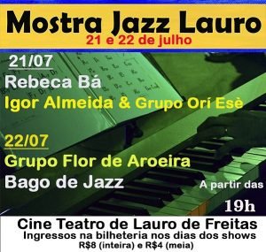O primeiro dia da Mostra Jazz Lauro (21/7) foi sensacional. As apresentaA�A�es da cantora Rebeca BA? ao lado do pianista IsaA�as Rabelo e do trombonista Igor Almeida com o grupo OrA� EsA? foram dignas de um grande festival de jazz. O pA?blico ficou encantado com o alto nA�vel apresentado. Hoje (22) A?ltimo dia, teremos Grupo Aroeira (chorinho) e a turma do Bago de Jazz com a participaA�A?o especial de Lussy Dinniz cantando mA?sica francesa em jazz. A Mostra Jazz Lauro acontece no Cine Teatro de Lauro de Freitas, a partir das 19h. Ingressos no local, R$ 8 (inteira) e R$ 4 (meia).