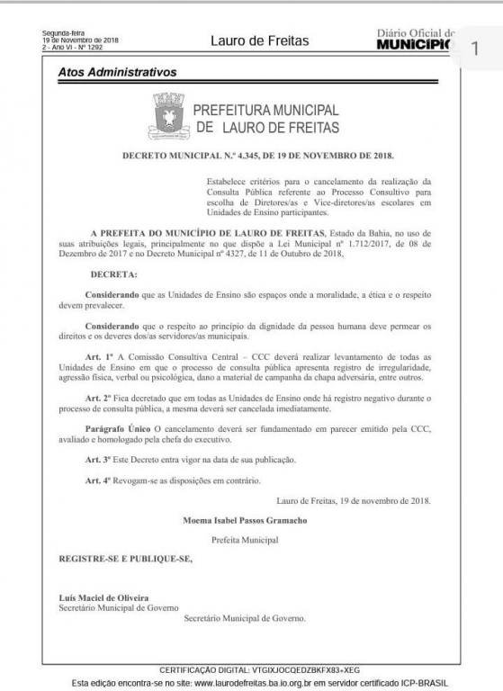 O vereador Edivaldo Palhaço (PSB), presidente da Comissão de Educação da Câmara Municipal, de Lauro de Freitas e membro da comissão consultiva, que está organizando, a consulta pública, para escolha de vice e diretores da rede pública, declarou que a prefeita Moema Gramacho acertou em decretar o cancelamento das escolas que tem algum tipo de conflito no processo seletivo que elegerá novos gestores. Ele parabenizou a atitute coerente, do referido decreto, que cancela imediatamente, o processo de consulta pública, nas unidades de ensino, que a Comissão Consultiva Central (CCC), identificar a prática de irregularidade, agressão verbal ou psicológica, dano material a chapa concorrente, dentre outros. A publicação foi feita no diário oficial desta segunda-feira (19).