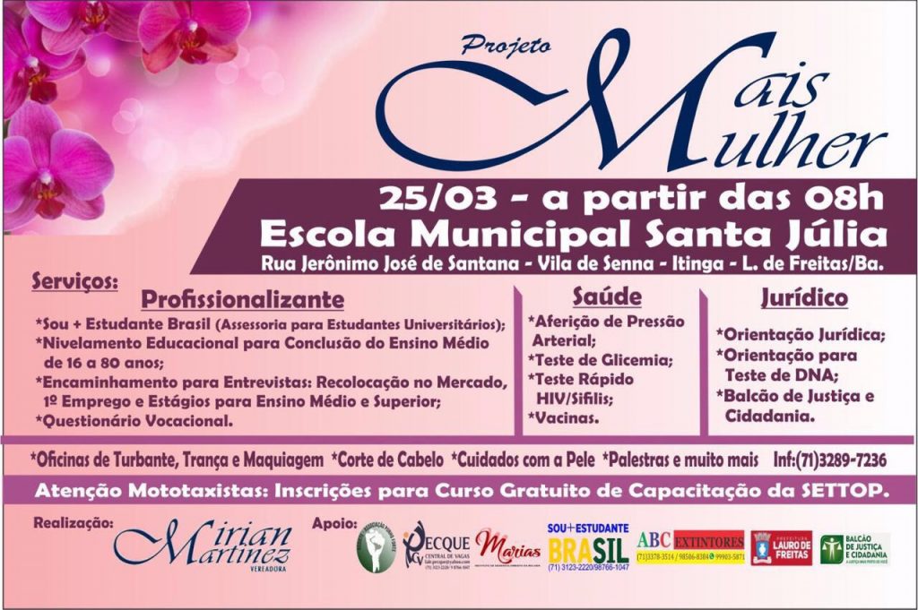 A vereadora Mirian Martinez realizarA? neste sA?bado (25), a partir da 08h da manhA?, na Escola Municipal Santa JA?lia, em Itinga, o Projeto Social Mais Mulher.