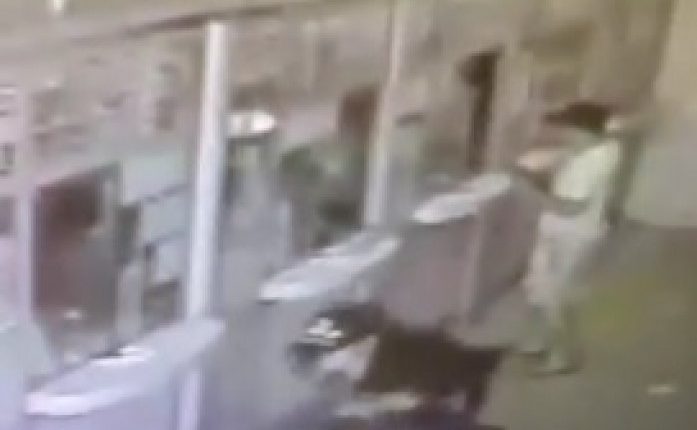 VA�deo: bandido tenta quebrar vidro de lotA�rica com arma e atira em comparsa